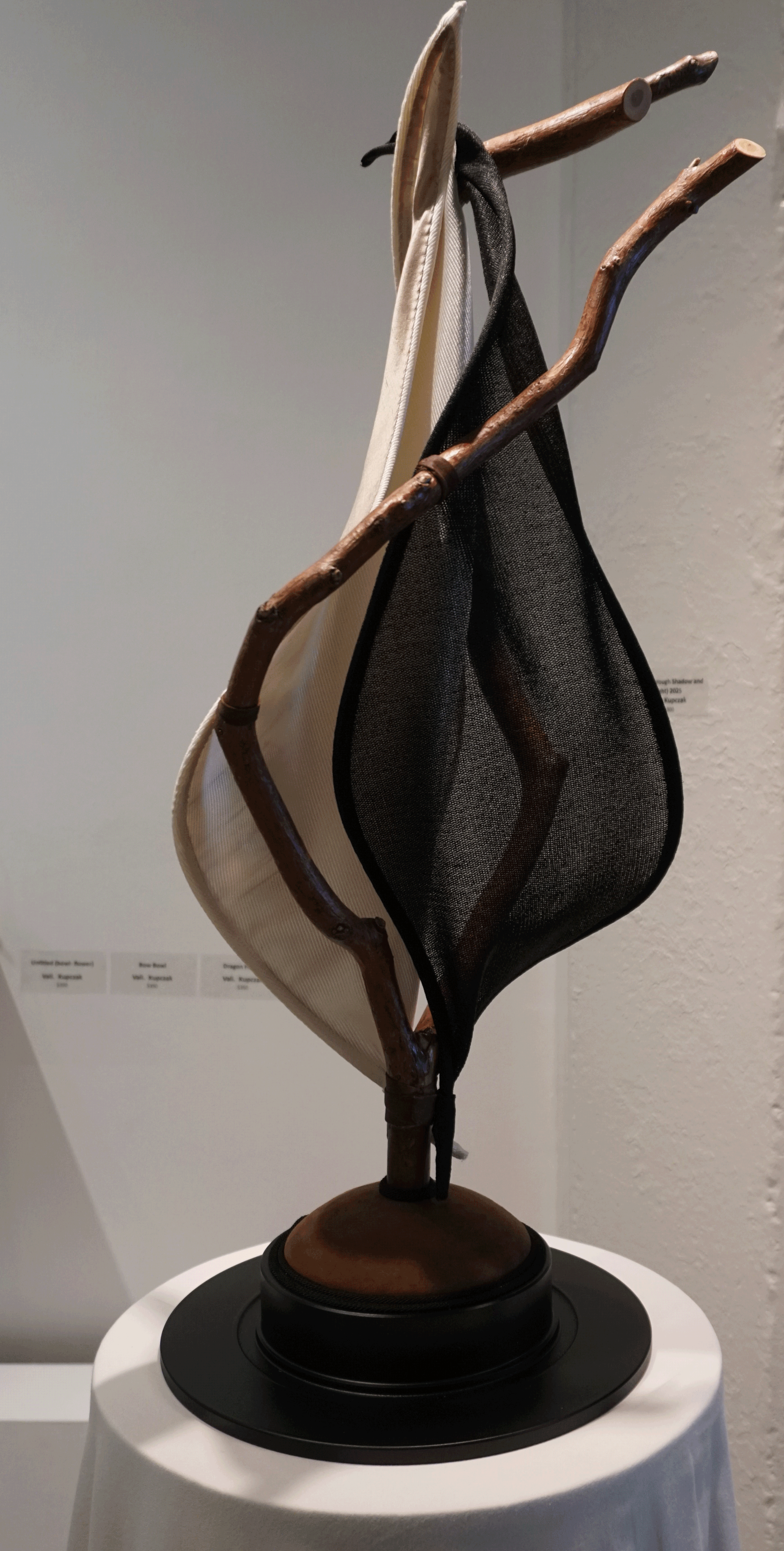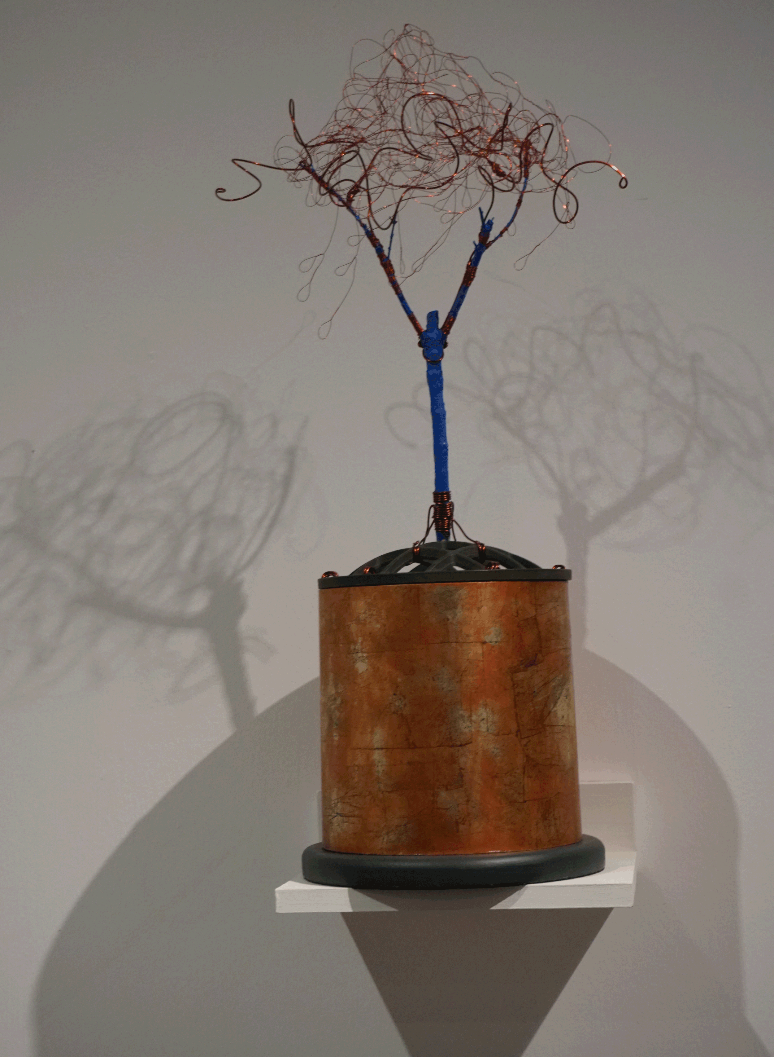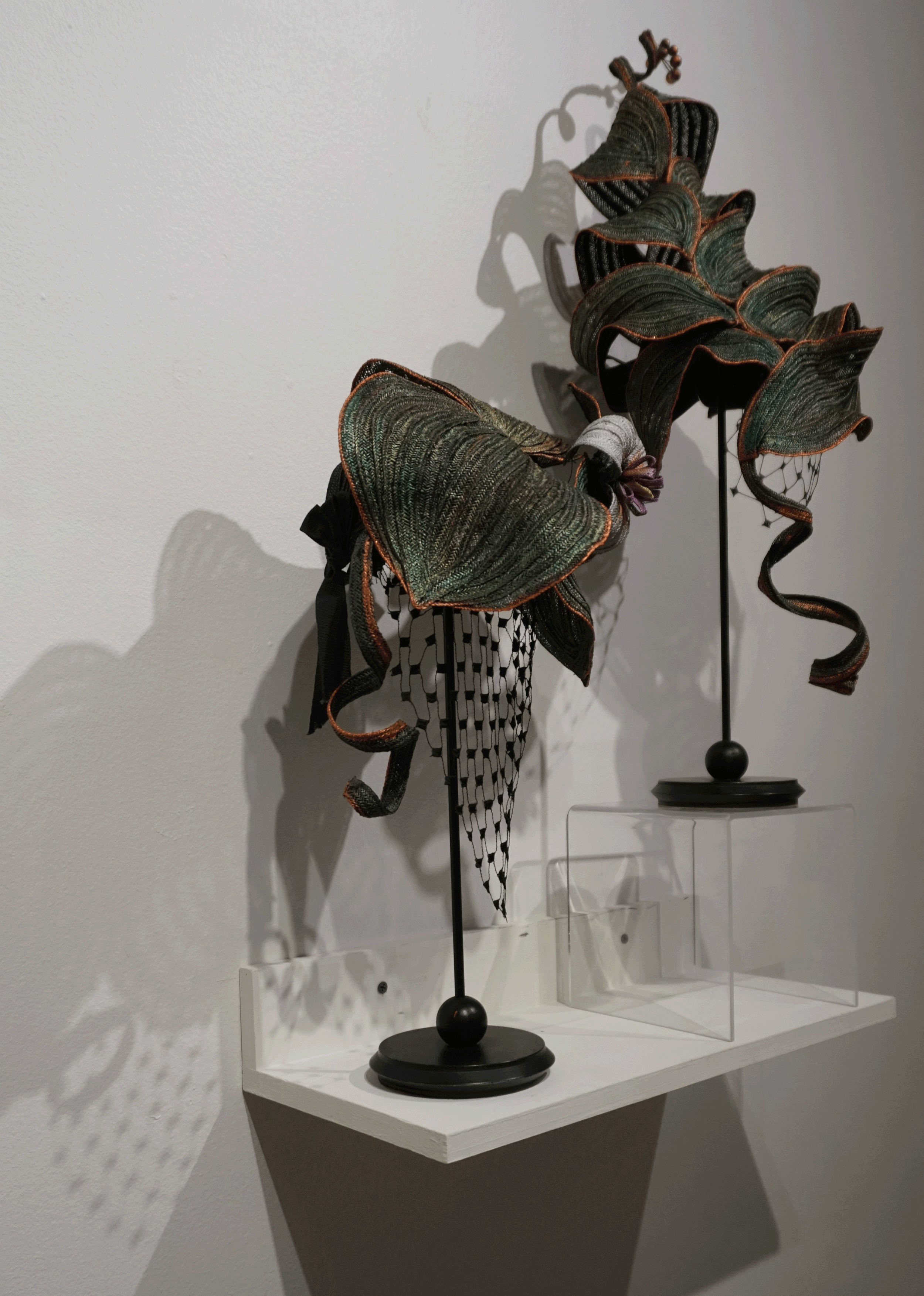 ONE THING LEADS . . . portrays the progression of early work in wearable art clothing and hats, now transformed to freestanding sculptural shapes. Inspired by trees, plants and organic forms, fiber is twisted, pleated, dropped and sewn. Found objects are layered, wound with wire and embellished with paint. Contour abounds.