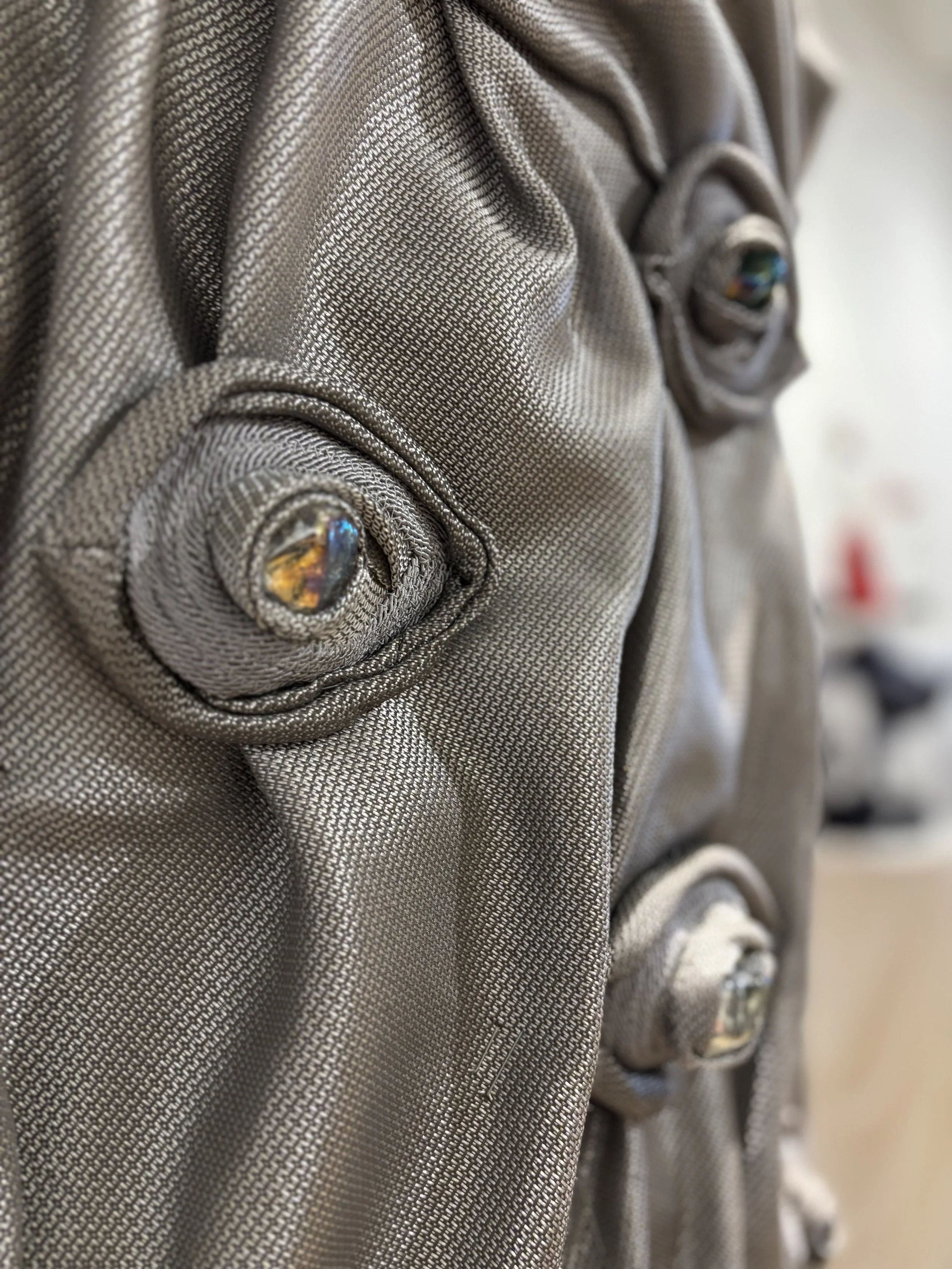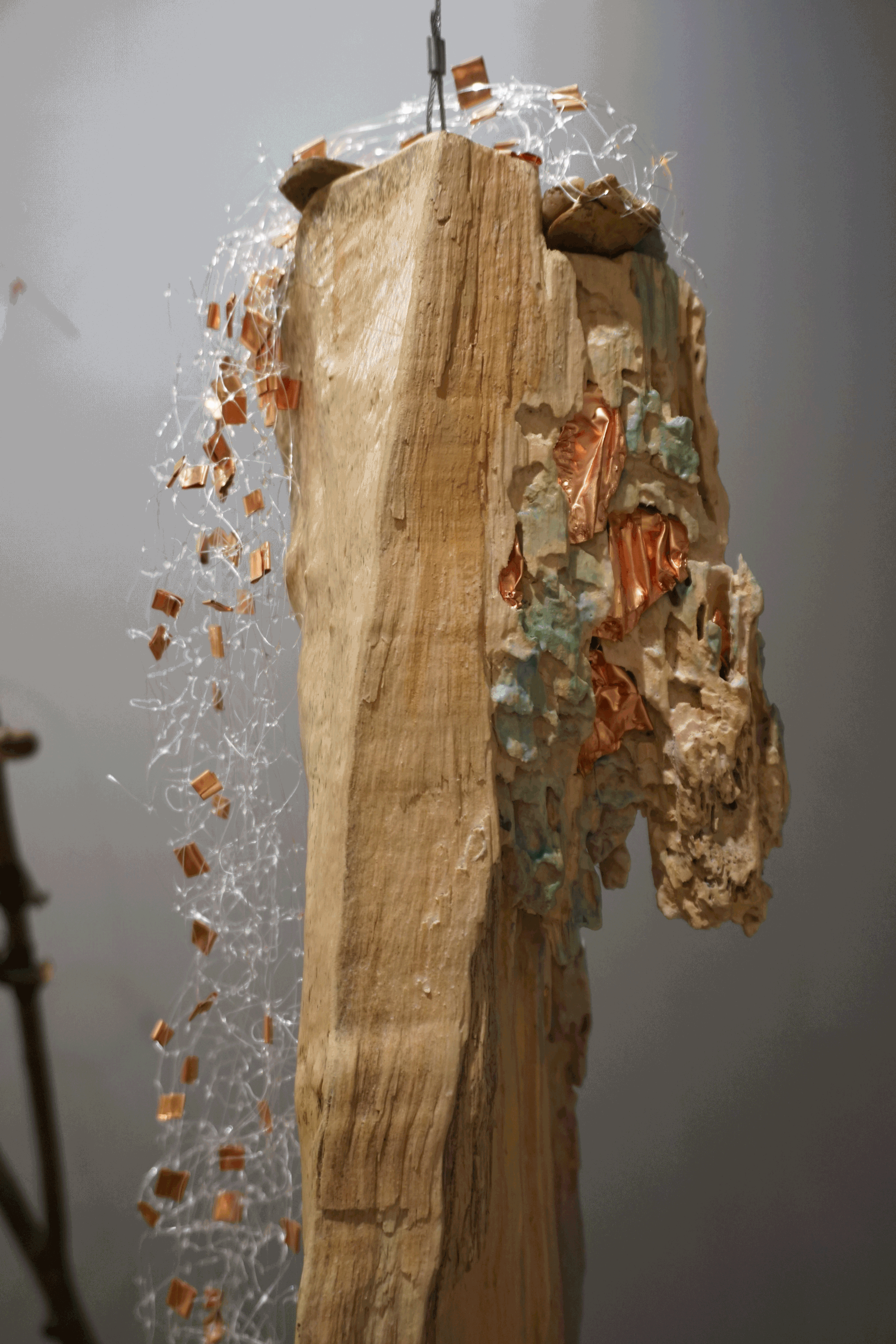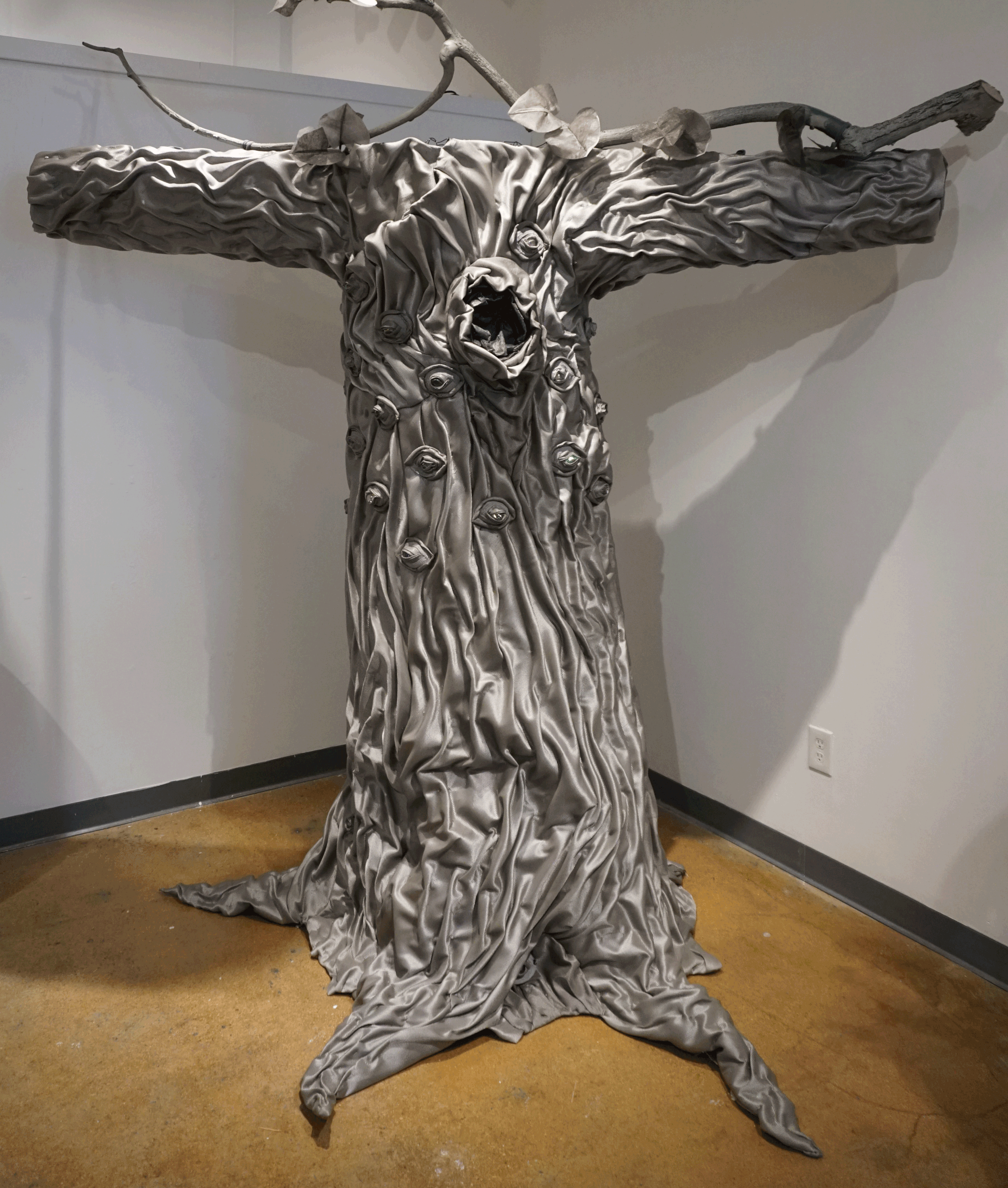 ONE THING LEADS . . . portrays the progression of early work in wearable art clothing and hats, now transformed to freestanding sculptural shapes. Inspired by trees, plants and organic forms, fiber is twisted, pleated, dropped and sewn. Found objects are layered, wound with wire and embellished with paint. Contour abounds.
