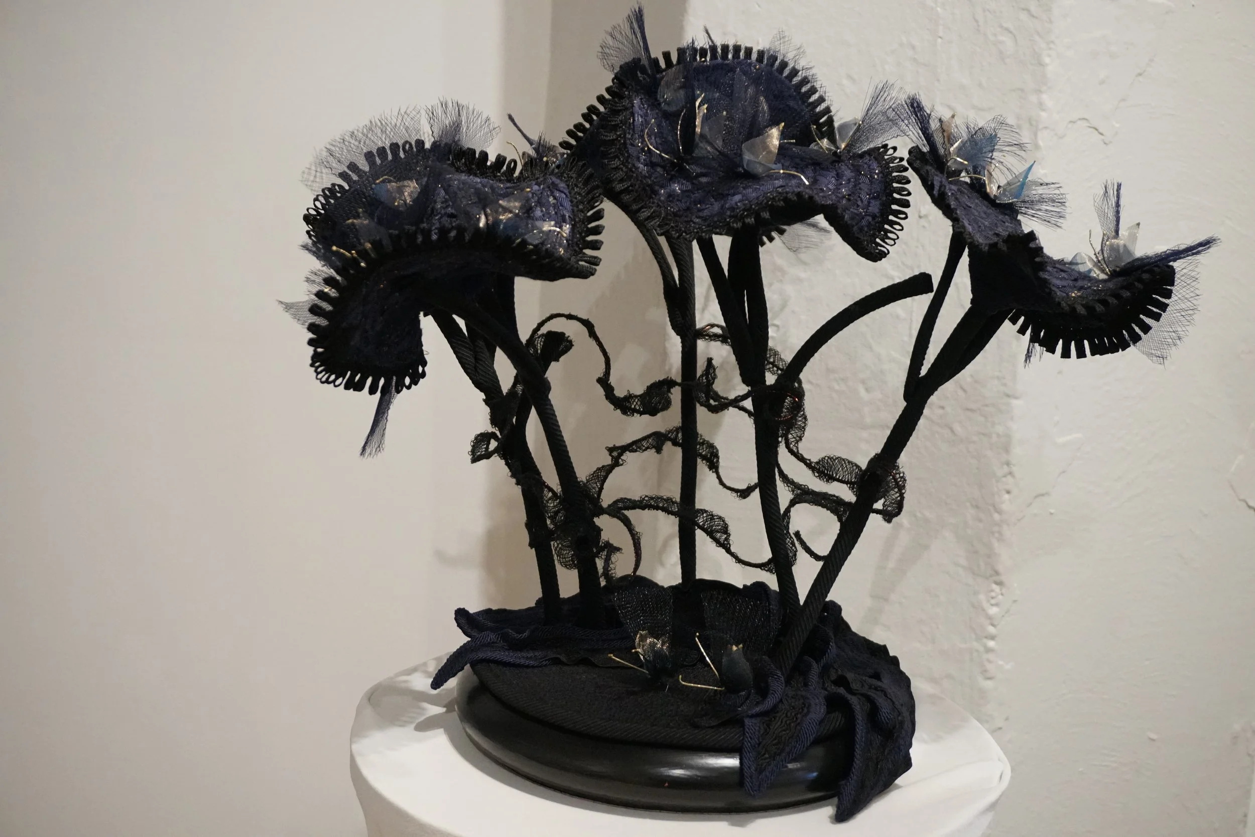 ONE THING LEADS . . . portrays the progression of early work in wearable art clothing and hats, now transformed to freestanding sculptural shapes. Inspired by trees, plants and organic forms, fiber is twisted, pleated, dropped and sewn. Found objects are layered, wound with wire and embellished with paint. Contour abounds.