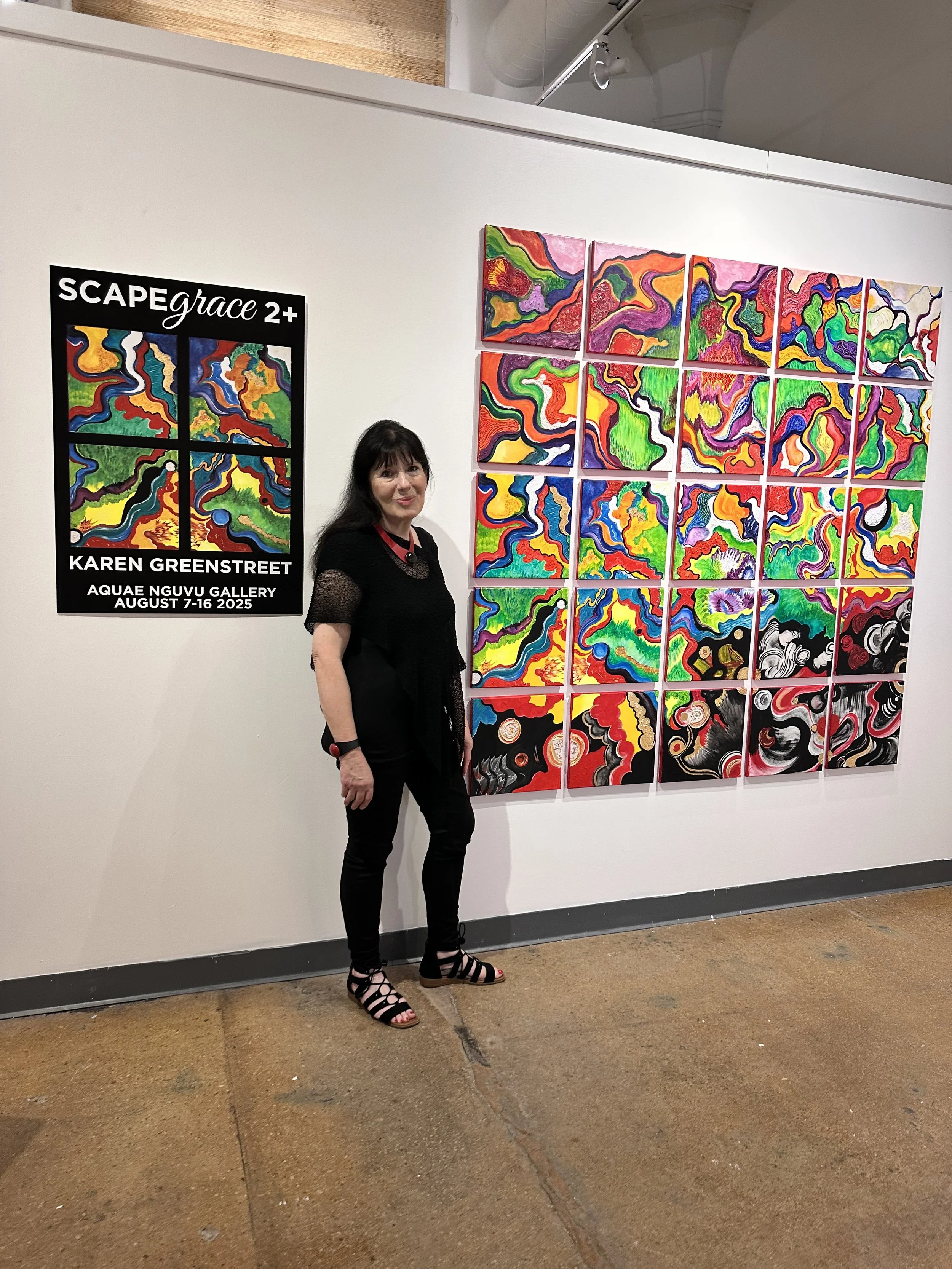 In addition to the Aquae Nguvu show, Karen has exhibited her work in April 2025 at 16 Gallery in Cheltenham, UK. Earlier exhibition venues include Grove Gallery and The Couture, Milwaukee. She is also scheduled to exhibit at the North Wall Gallery in Oxford, UK.